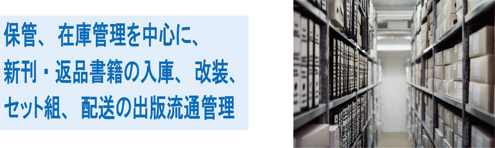 書籍・ムック・雑誌の出版物および、ビデオ・CDなどの関連商品を紛失、破損のないようにタイトルごとに仕分けし、パレット又は棚で管理しています。